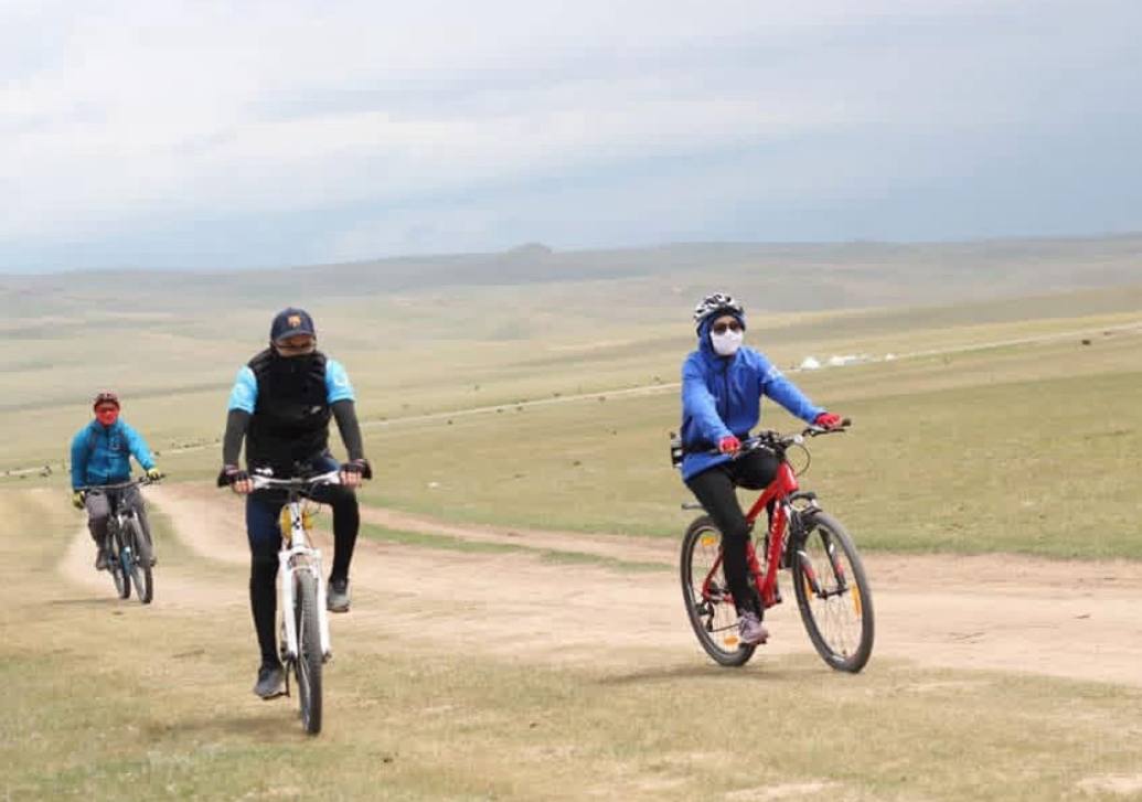 Начало вело спуска с перевала до Юрточного Лагеря Батай Арал. Дистанция 15км сброс высоты 410м. Обед по дороге.
